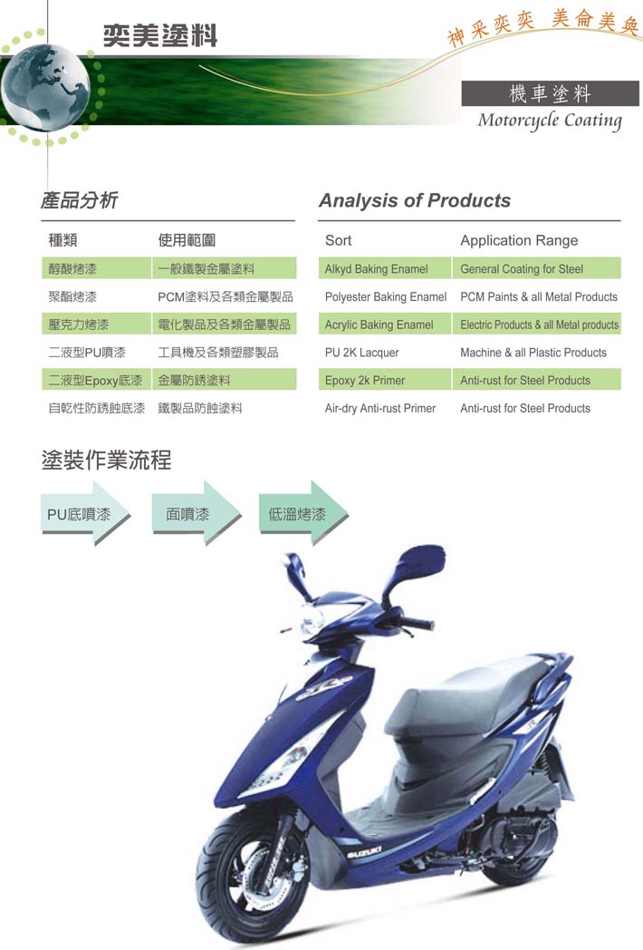 您現在的位置:臺灣奕美涂料相關汽、機車涂料及耐高溫單組份膩子